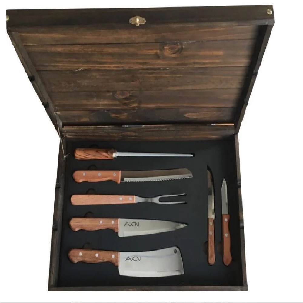 Kit Churrasco com estojo de madeira envelhecida. Tábua de churrasco com alça 43cm X 30cm. Faca de churrasco Tramontina 7”. Cutelo. Faca de pão 7”. Faca de legumes. Faca de serra de mesa. Garfo Trinchante Tramontina Grande. Chaira (afiador). Embalagem: Caixa para presente com listras em marrom.
