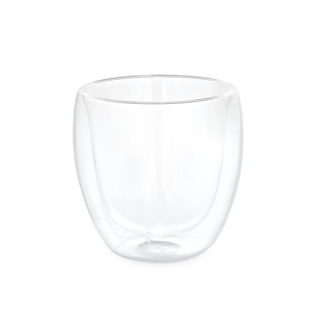 Copo em vidro borossilicato com parede dupla isolada a ar. Capacidade até 220 mL. Fornecido em caixa presente personalizável. Certificação EU Food Grade. ø80 x 86 mm
