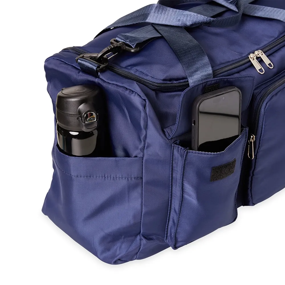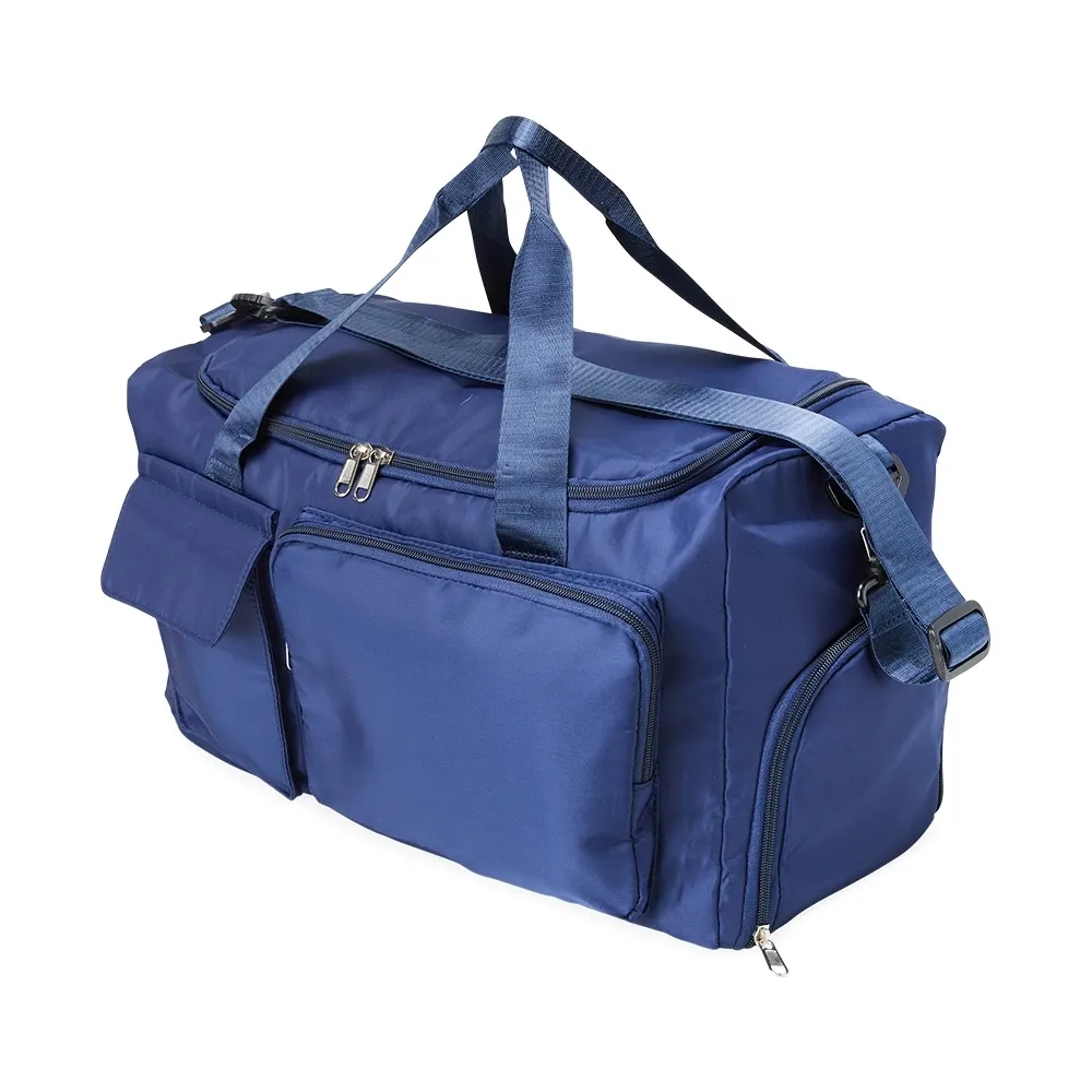 Bolsa de viagem 28 litros em poliéster de impacto impermeável com cinco compartimentos, sendo um deles exclusivos para tênis. Compartimento principal com bolso de zíper exclusivo para itens molhados. Com bolso lateral e duas alças de mãos, a bolsa contém alça transversal removível e bolso para engate em malas de viagem.
