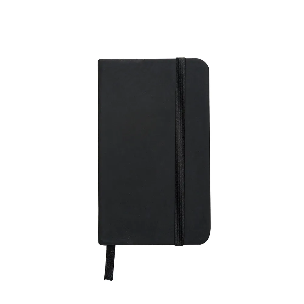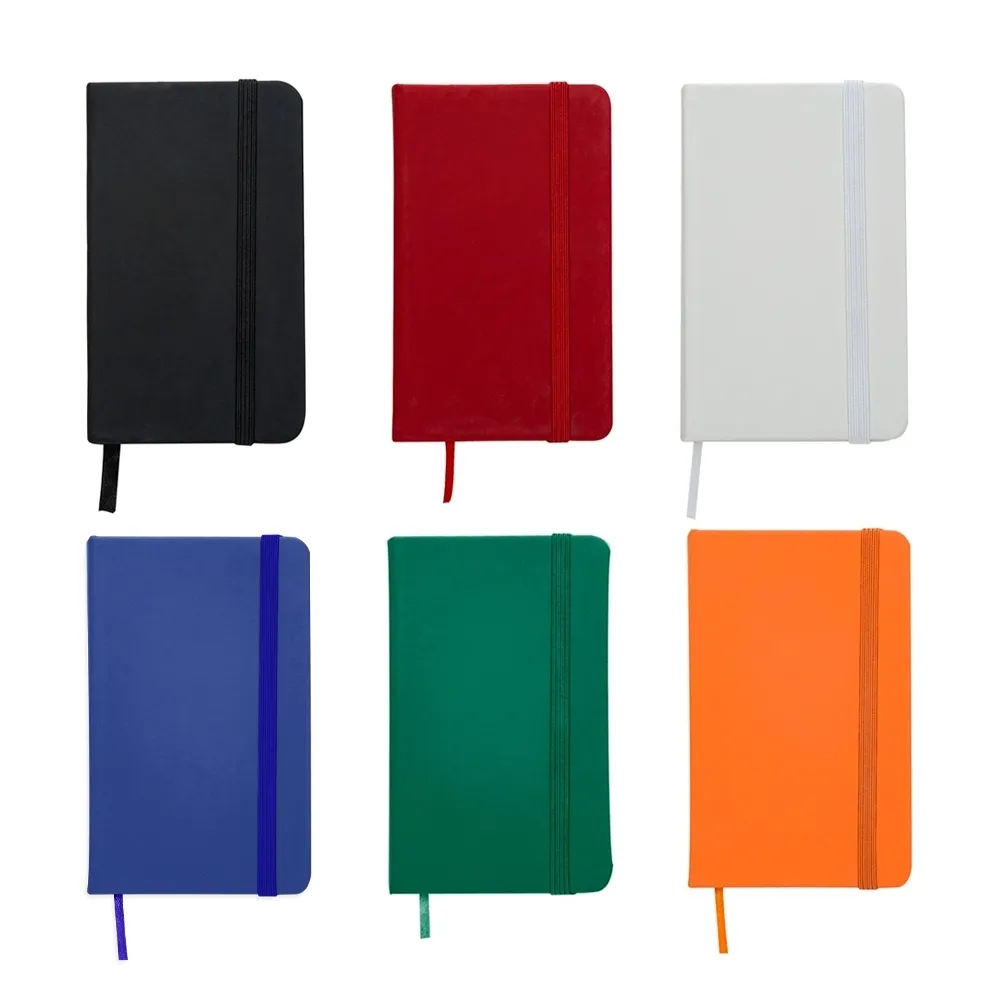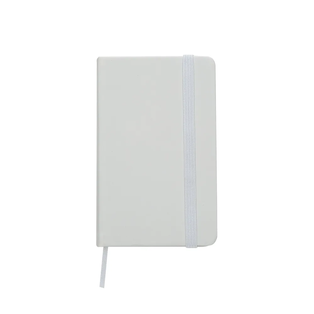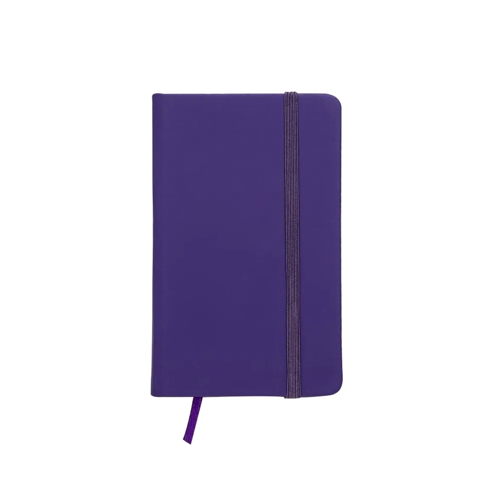 Caderneta emborrachada com elástico para lacre e marcador de página em cetim, contém aproximadamente 84 folhas com pauta na cor marfim.