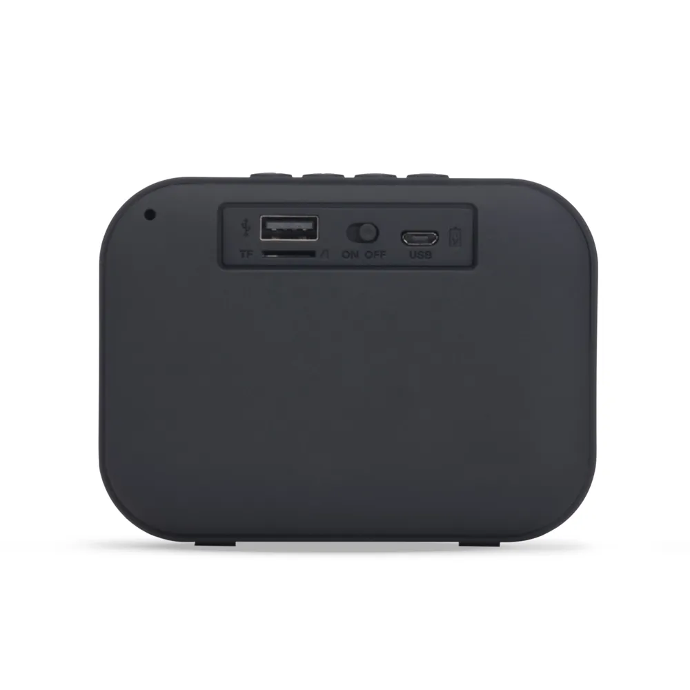Caixa de Som Multimídia. Produzida em material emborrachado, tela de proteção do auto-falante em tecido, parte inferior com borrachas anti-deslizantes. Possui os botões de Play/Pause; Aumentar e diminuir volume/avançar e retroceder faixas; Modo; Entrada USB; Entrada TF (cartão MicroSD); Botão On/Off e Entrada DC 5V. Acompanha cabo USB.