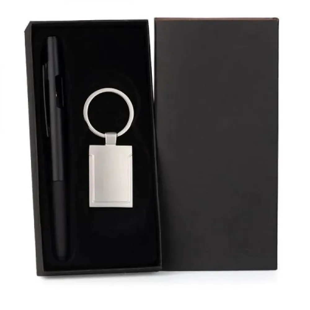 Conjunto caneta e chaveiro. Composto por caneta esferográfica em ABS preta com tampa que contém aberturas nas laterais, acabamento fosco, clipe em metal, ponteira touch em silicone preto e carga esferográfica azul. Conta também com chaveiro em metal injetado em liga de Zamac, acabamento cromado fosco, detalhes e argola em cromado brilhante