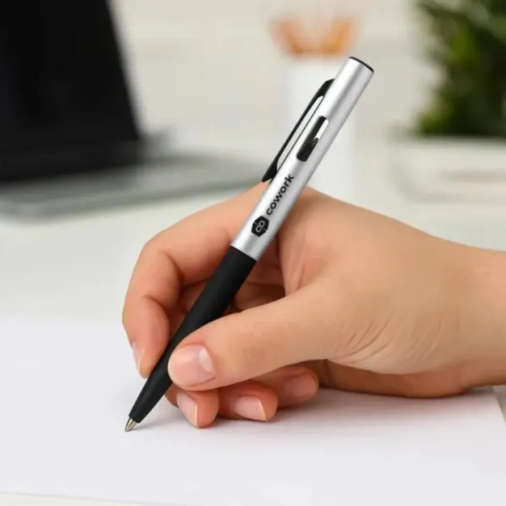 Caneta esferográfica em ABS prata. \nConta com tampa com abertura nas laterais, acabamento fosco, clipe em metal e ponteira touch em Silicone preto. Carga esferográfica azul.
