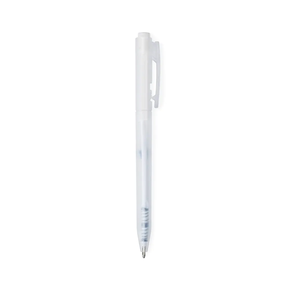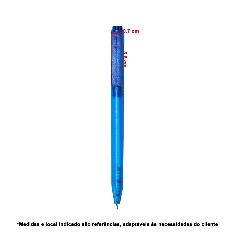 Caneta plástica translúcida com carga esferográfica azul 1mm e acionamento por clique.\r\n\r\nOBS.: PEDIDOS MÍNIMO DE 50 PEÇAS!