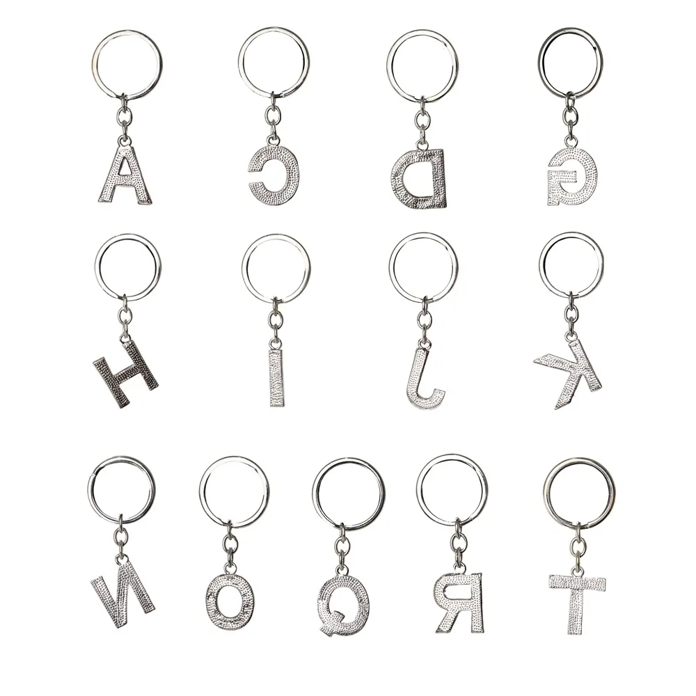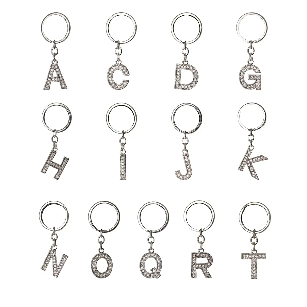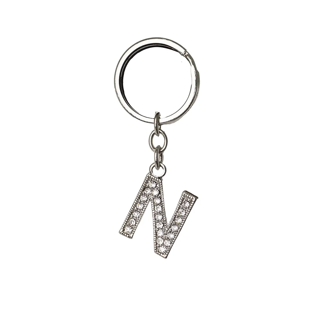 Chaveiro de metal, formato letra com detalhes em pedras brilhantes.