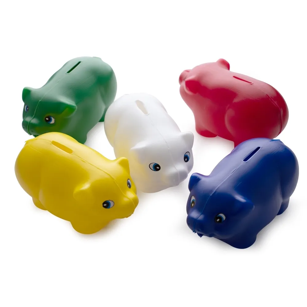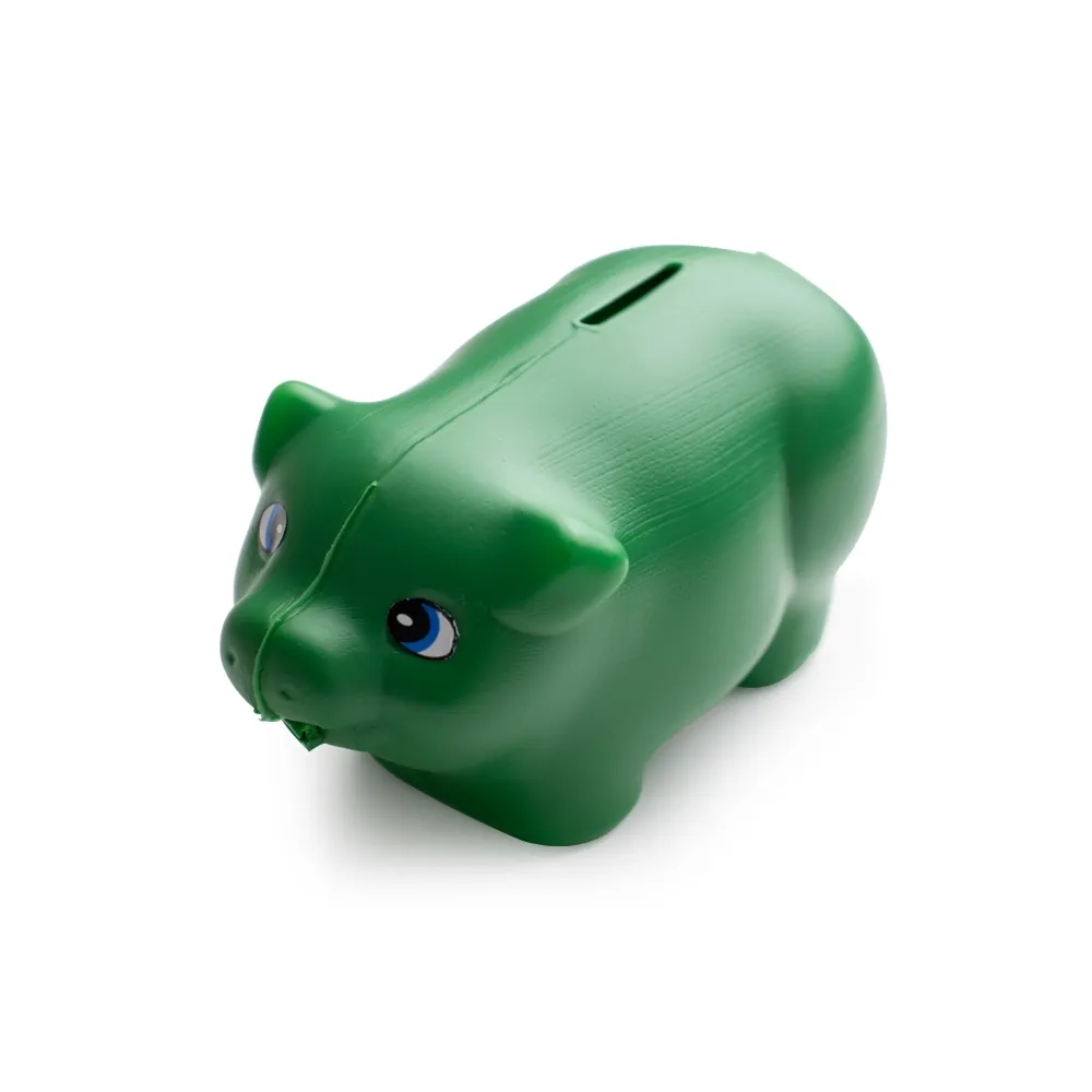 Cofre em formato de porco de plástico. O cofre possui abertura na parte superior para inserção de dinheiro ou moedas, e para abri-lo, é necessário cortá-lo.