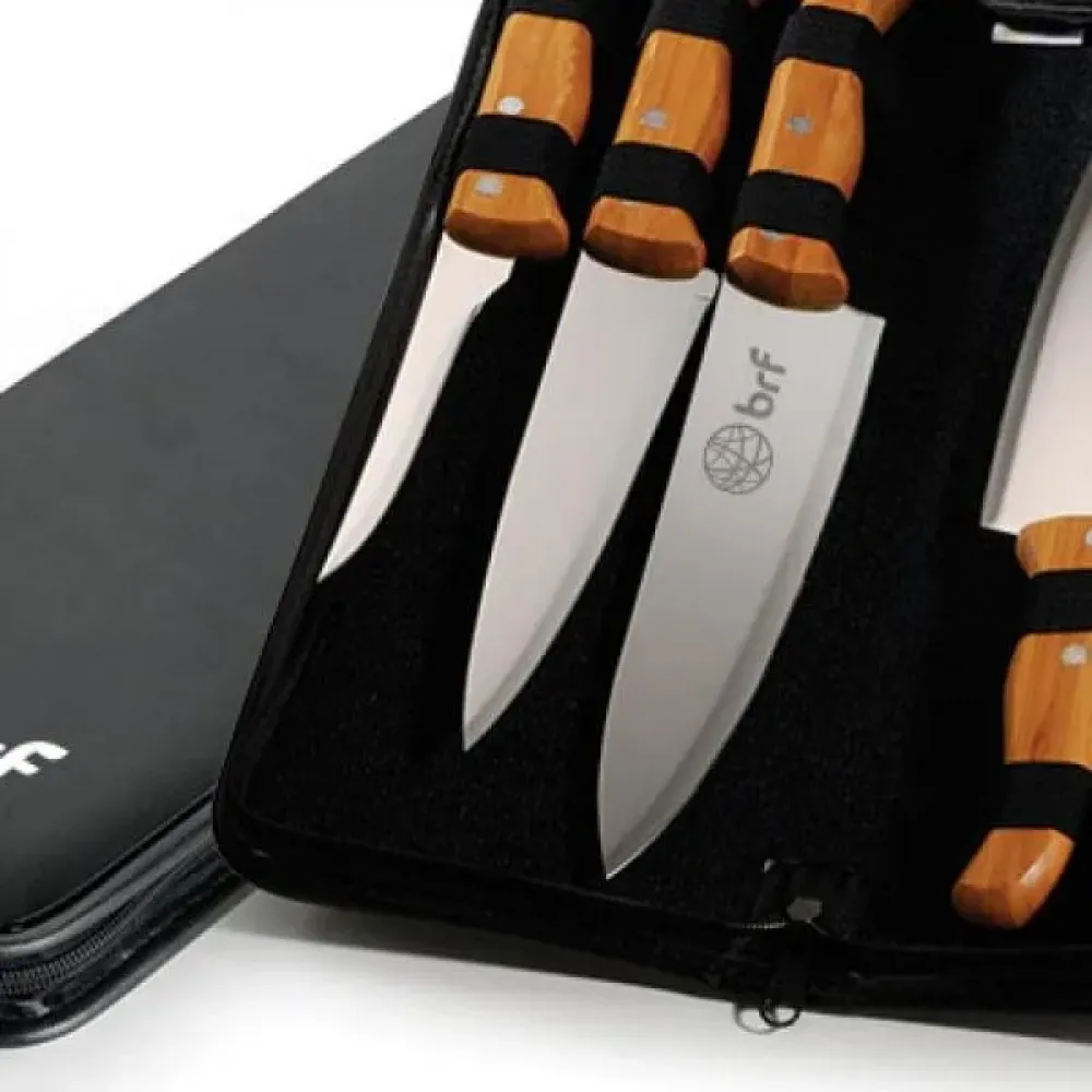Conjunto composto por uma faca 8”, cutelo 6”, faca 4” de frutas e faca 5” para desossar em Madeixa/Inox; faca 7” e chaira 8” em Bambu/Inox. Estão organizados em fita elástica preta no interior de um estojo.