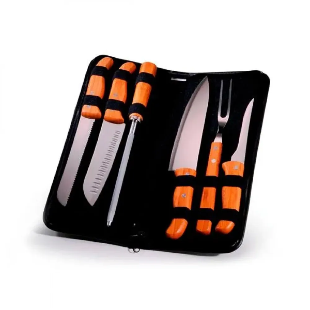 Composto por uma faca 8”, faca 5” para desossar e garfo trinchante em Madeixa/Inox; chaira 8”, faca Santoku 7” e uma faca 7” para pão em Bambu/Inox.\nEstão organizados em fita elástica preta no interior de um estojo.