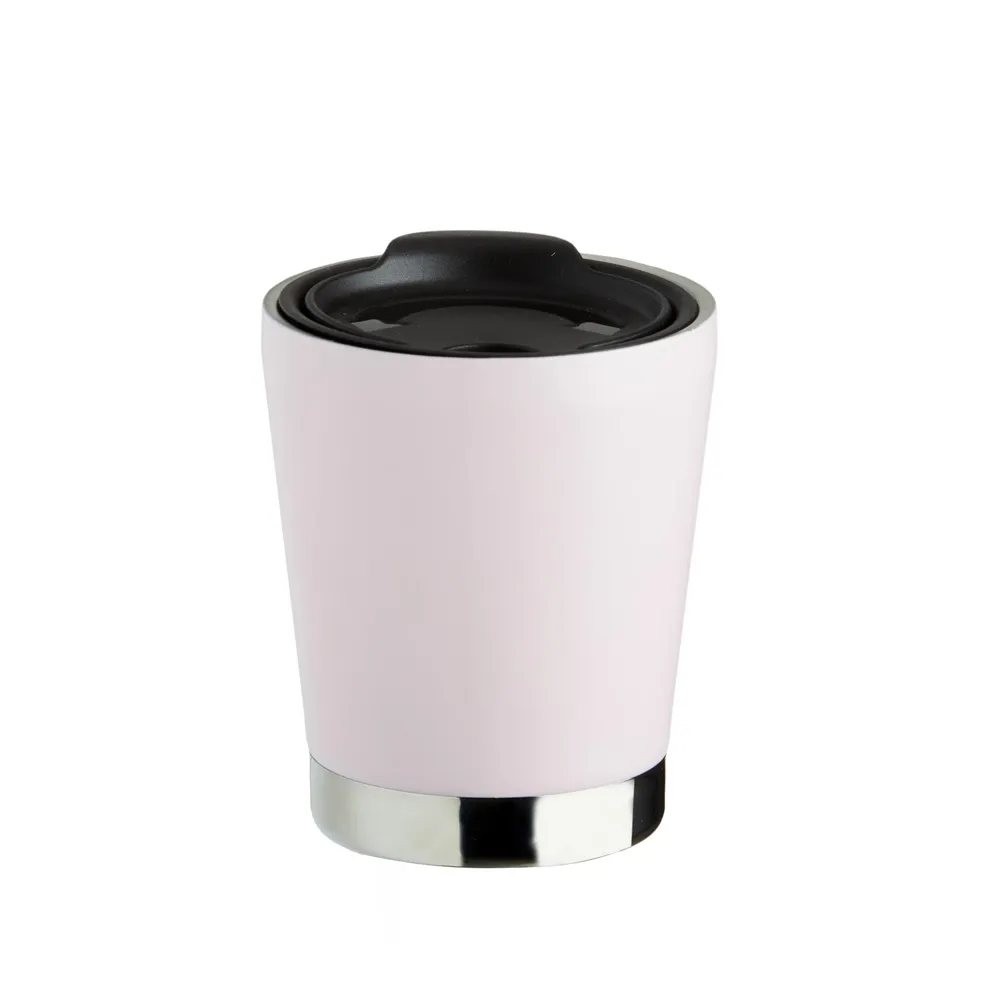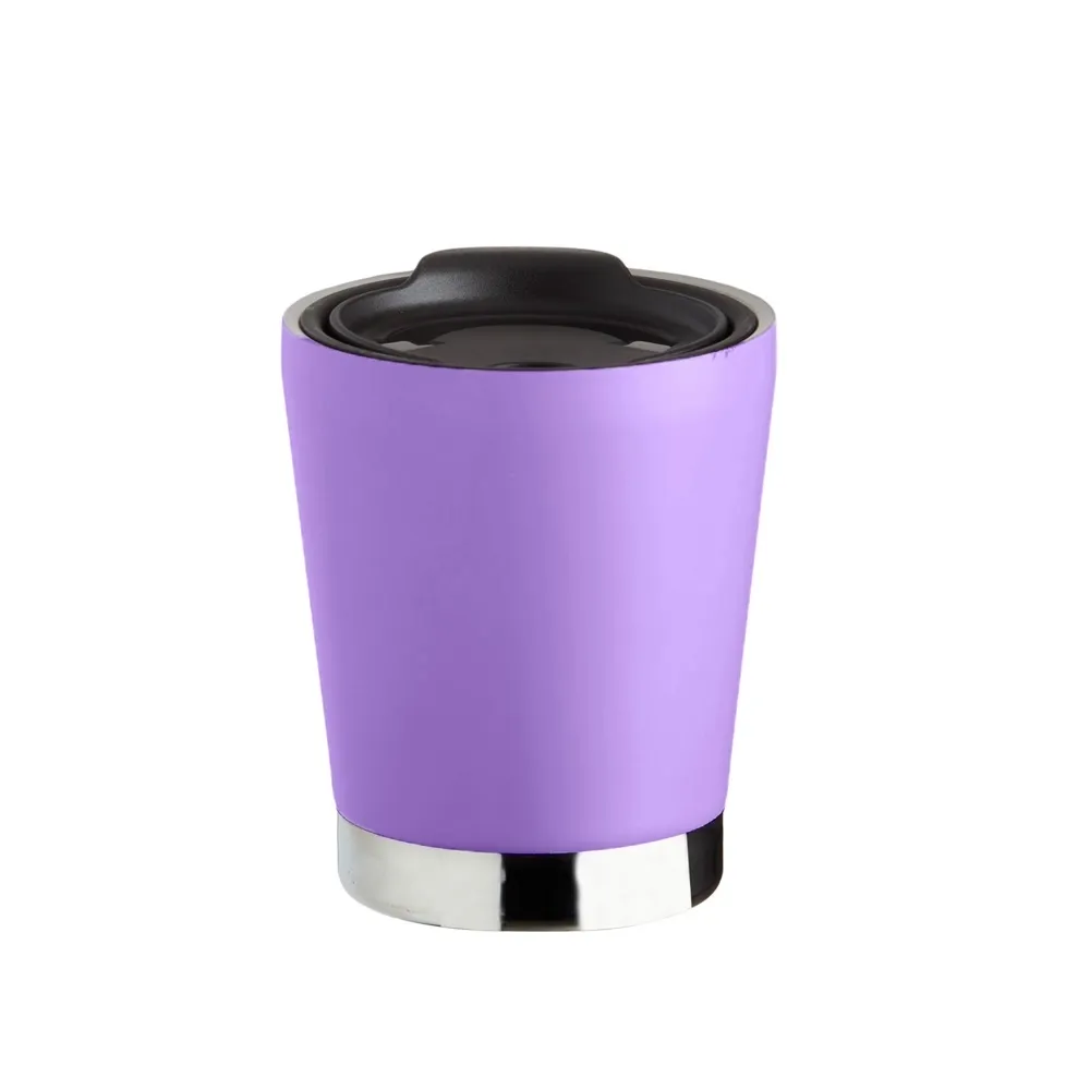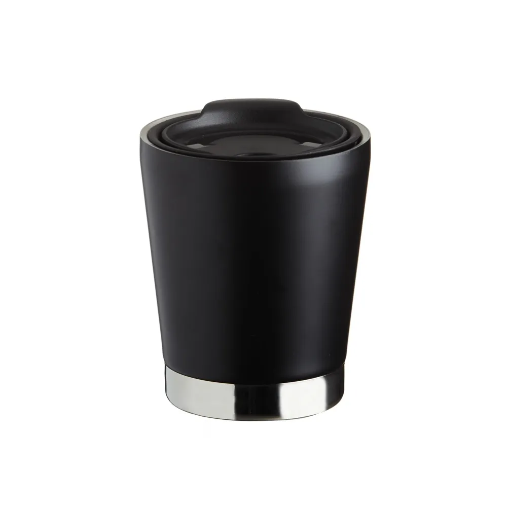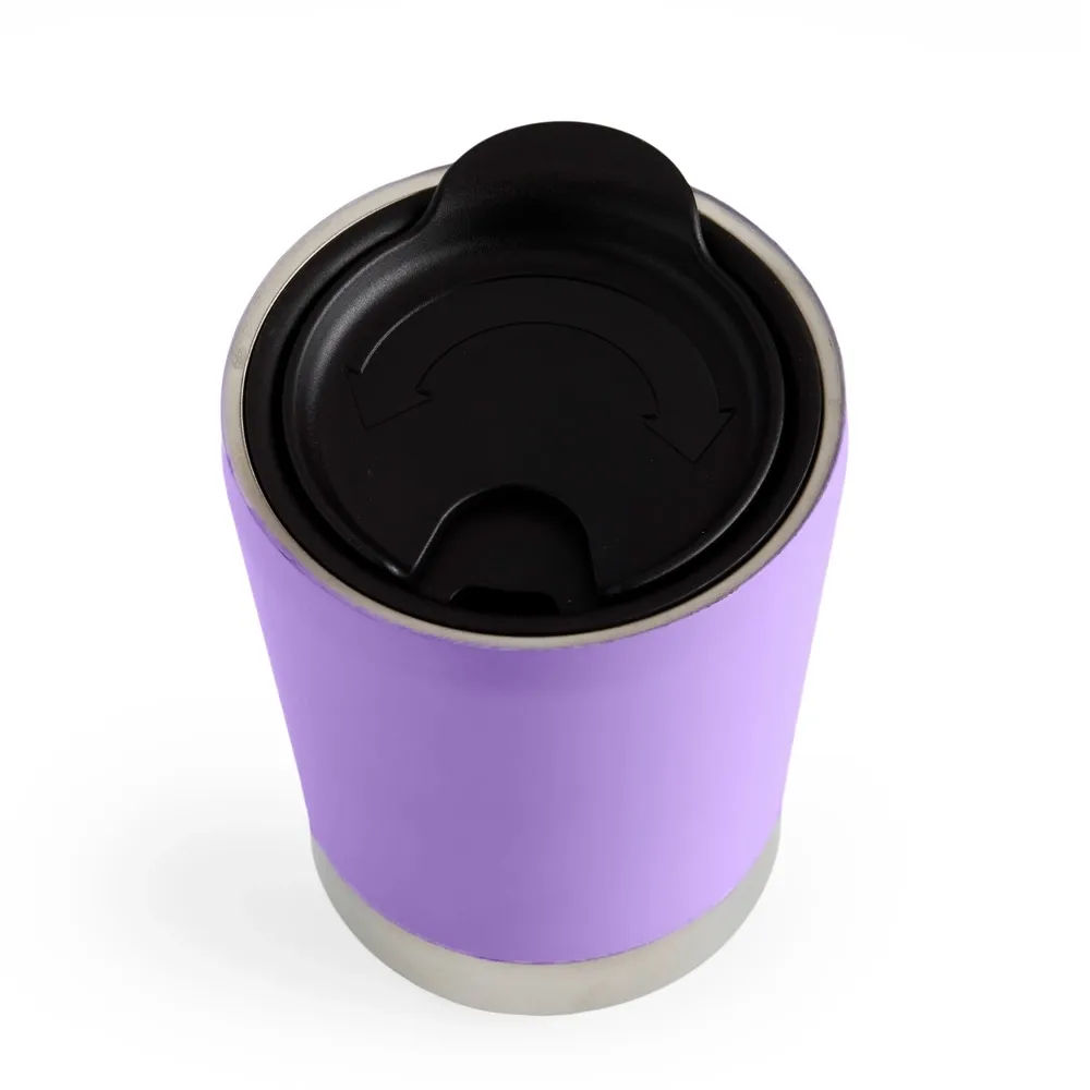 Copo isotérmico em inox 304 parede dupla com capacidade de 300ml, possui tampa plástica de encaixe com acesso ao bocal e área para canudo (não acompanha).