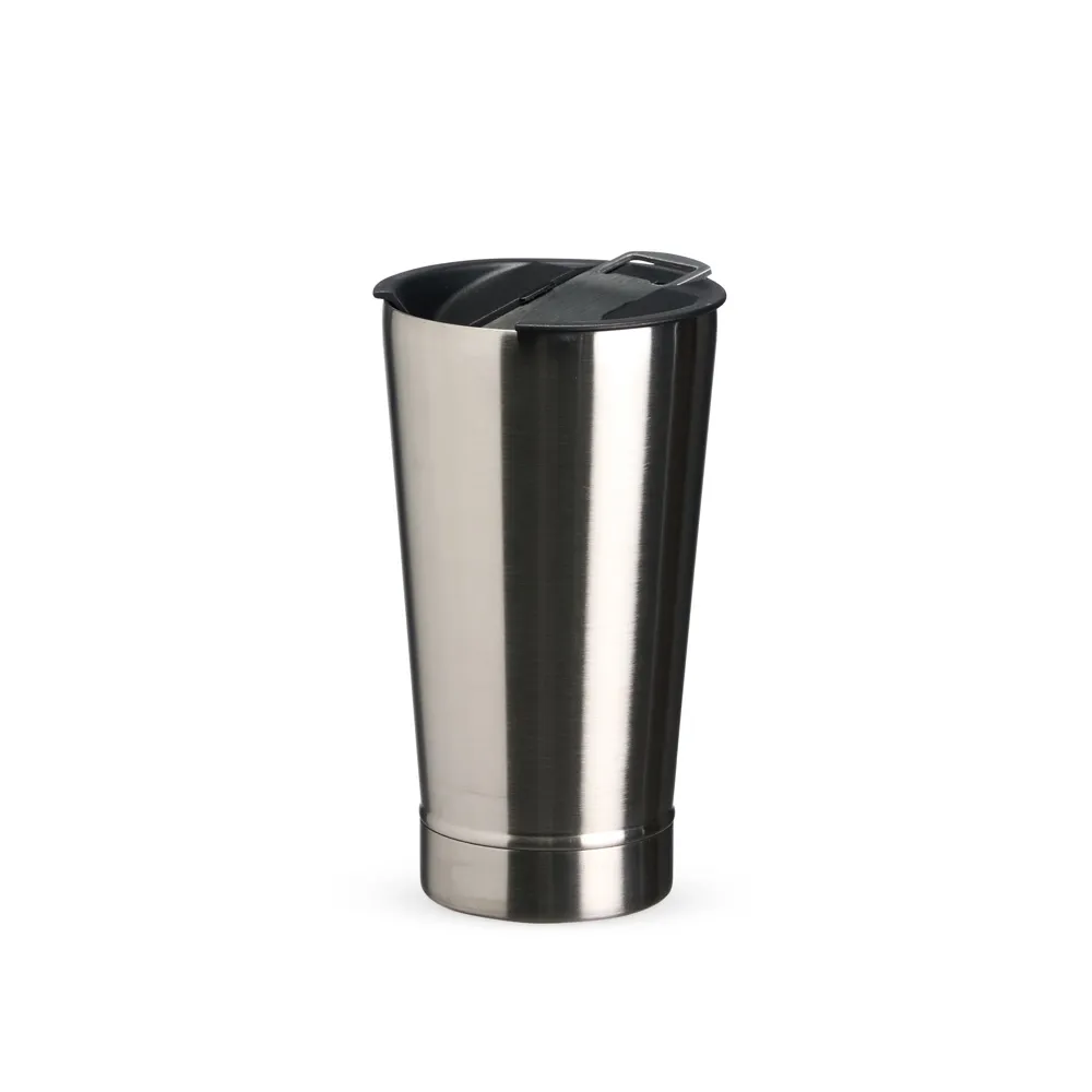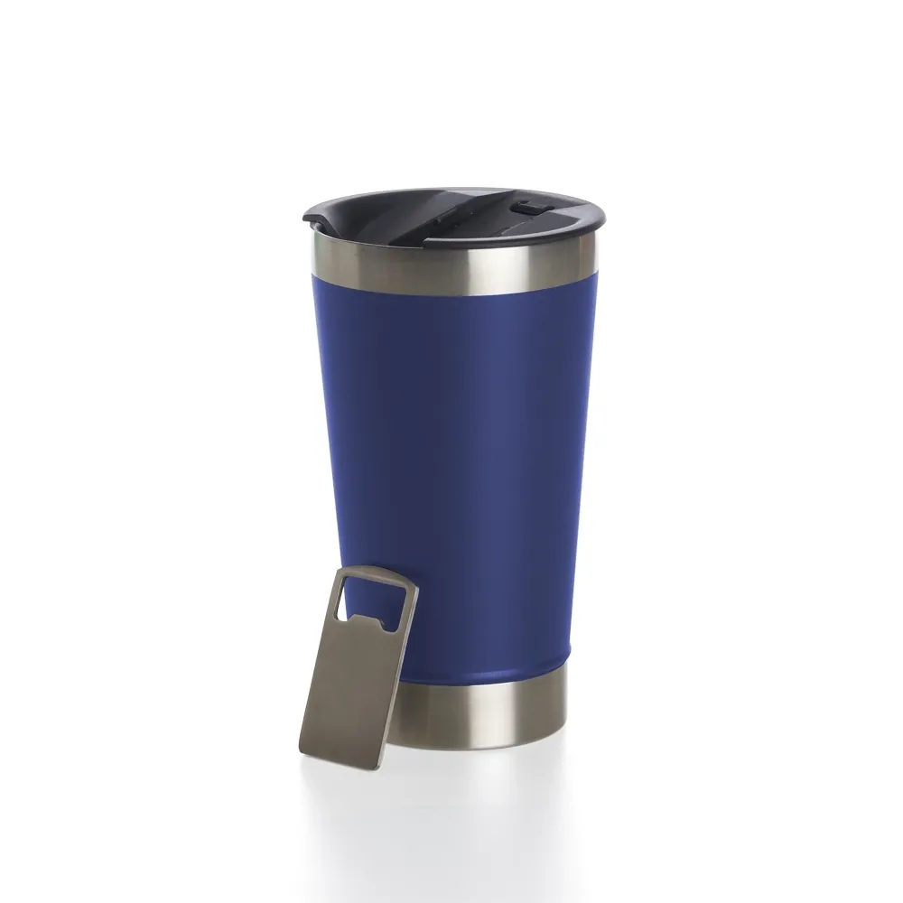 Copo térmico de inox com acabamento liso e capacidade 500ml, material livre de BPA. Contém tampa com abridor.