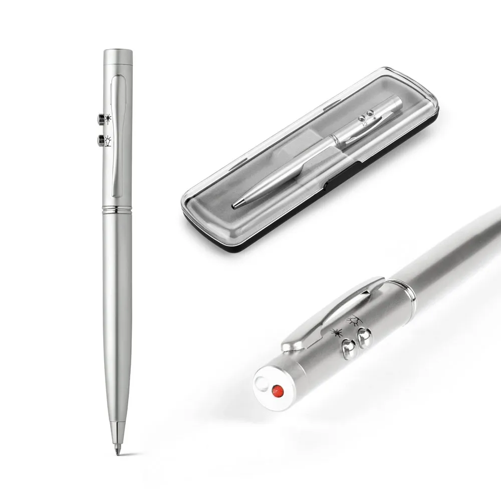 EBRE. Esferográfica em metal com ponteira laser, LED e escrita em azul