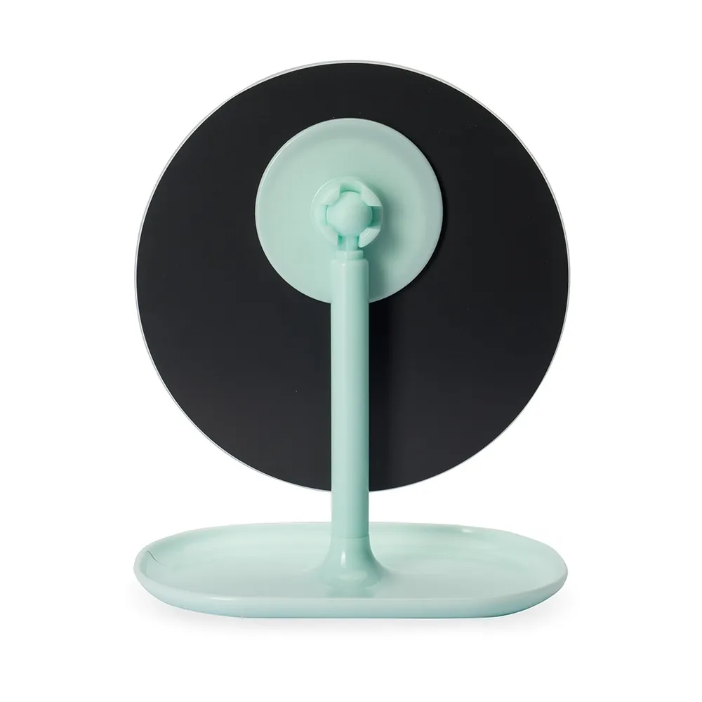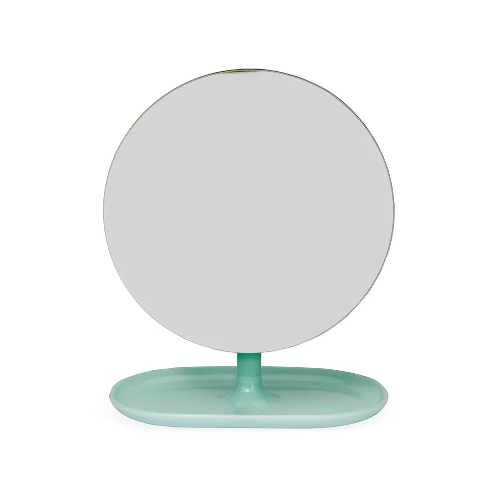 Um espelho de mesa com estilo minimalista que se adapta a diversos ambientes. Possui base fixa e pedestal giratório em 360 graus, ambos feitos em plástico, permitindo uma montagem simples e o ajuste em diferentes ângulos e posições.