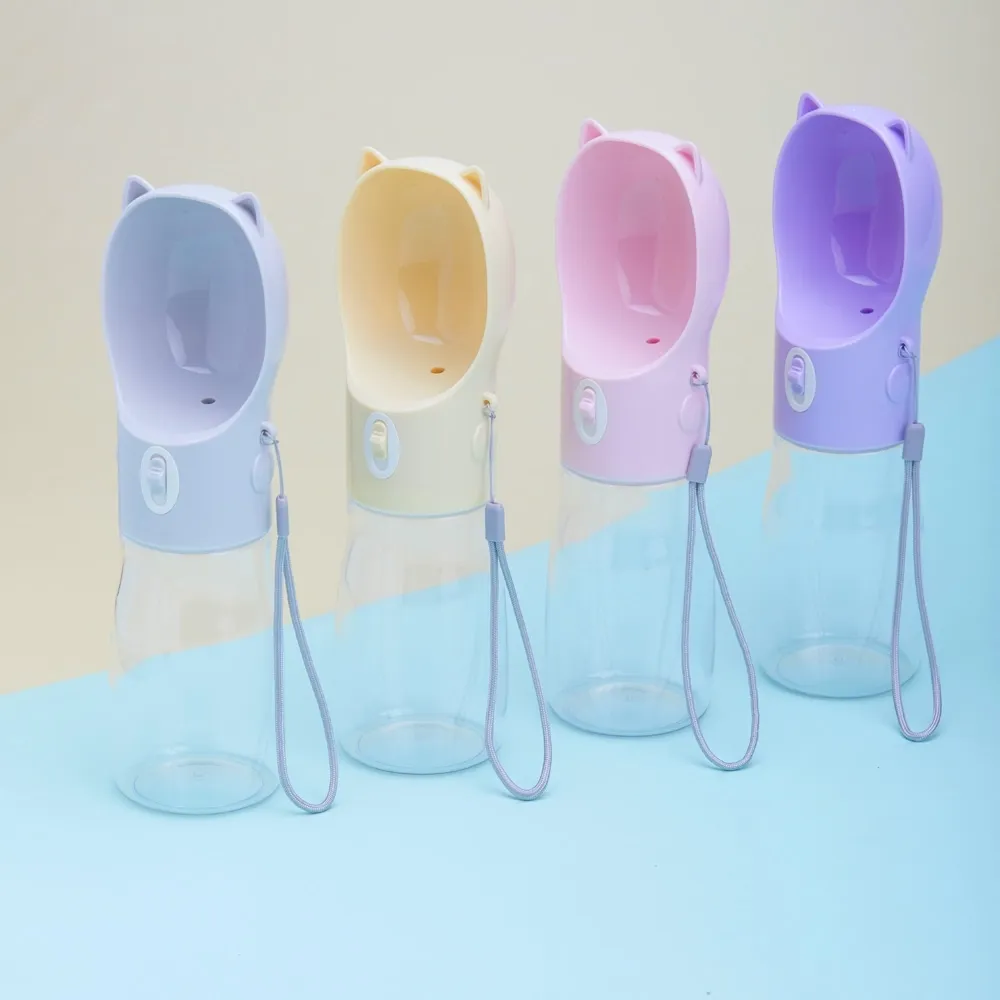 Garrafa bebedouro para pet feita em plástico com capacidade de 420ml. Basta acionar o botão para liberar o fluxo da água através da tigela. Acompanha alça de nylon para transporte.