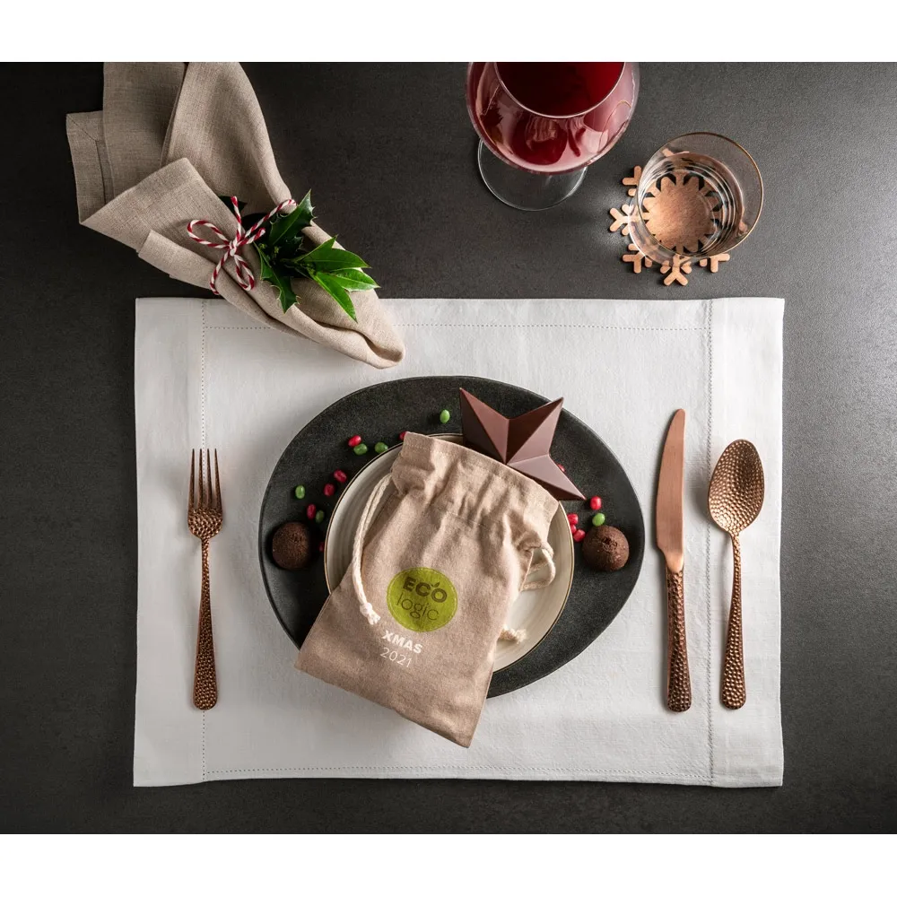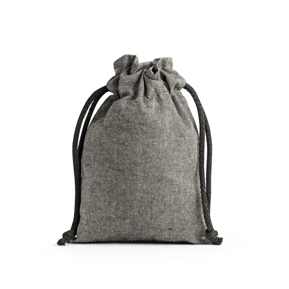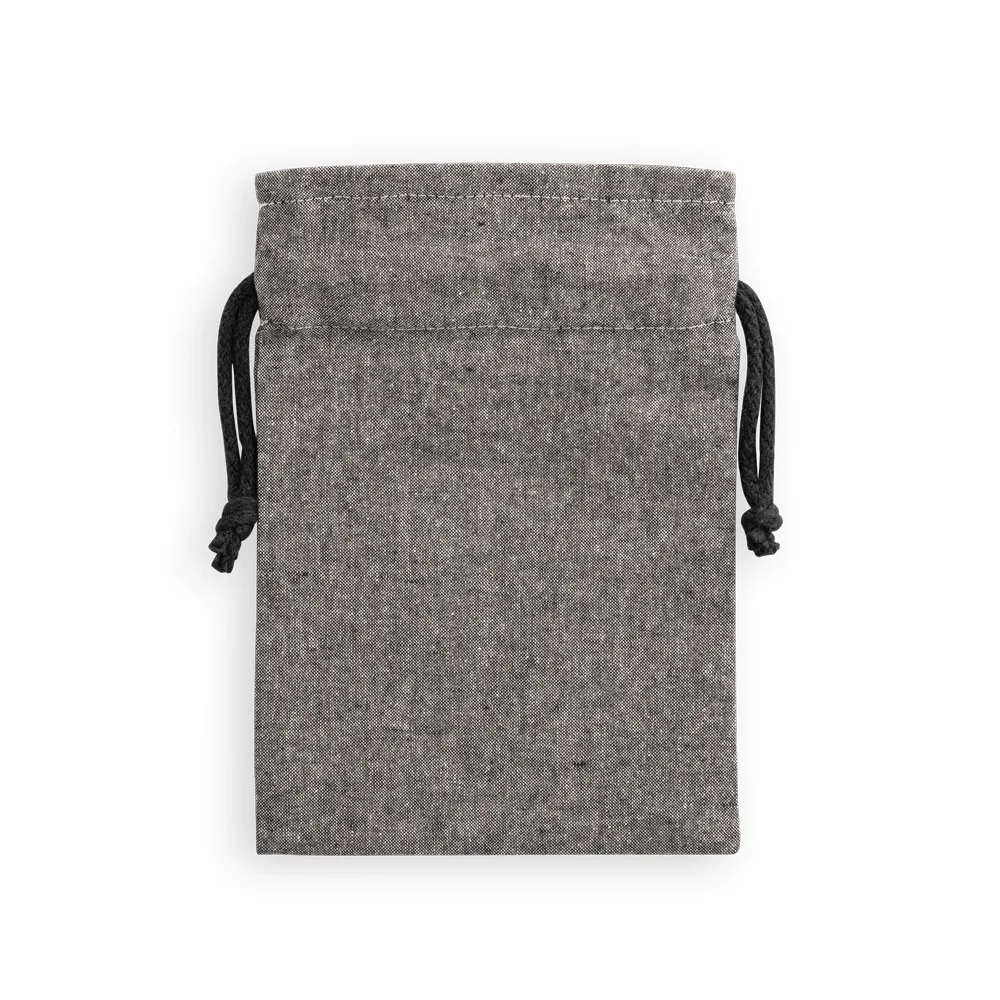 Sacola em 70% algodão reciclado e 30% poliéster reciclado (140 g/m²), com alças de algodão. O tecido é sem tingimento, e utilizado na sua cor original, sem produtos químicos de tingimento ou branqueamento, contribuindo para um menor impacto ambiental. 140 x 200 mm
