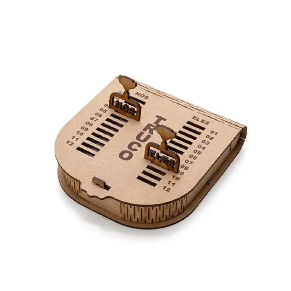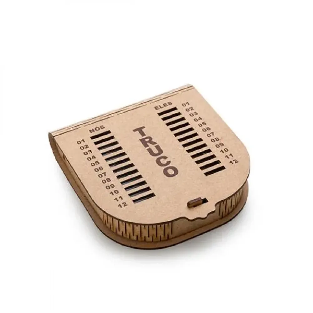 Kit Churrasco, Whisky e Truco. Composto por tábua com três furos em Bambu; garfo trinchante e faca 8 em Madeira/Inox; quatro copos de Whisky em vidro; caixa para truco com jogo de cartas, marcador de tentos e jogos em MDF.\nComo cortesia, na faca 8 fazemos uma gravação com os cortes do boi.