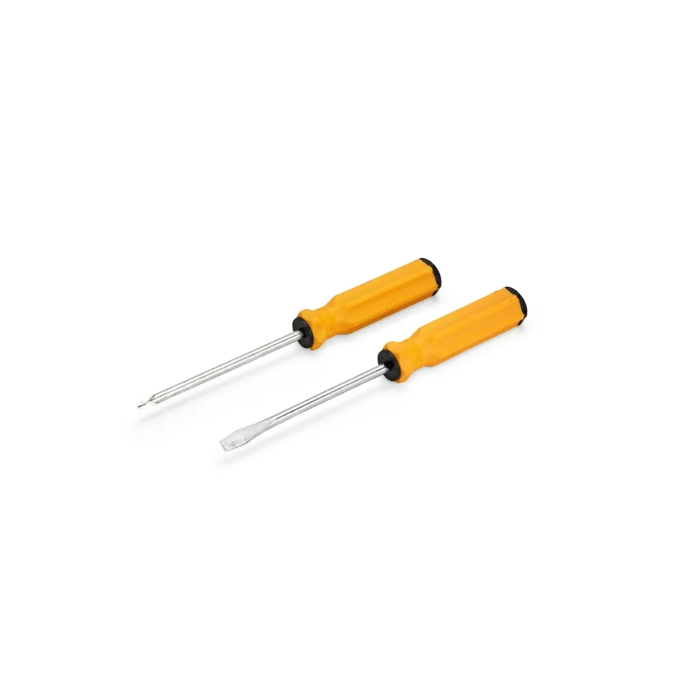Kit de ferramentas com duas chaves: uma chave de fenda e outra Phillips, ambas com cabo emborrachado ergonômico e ponta metálica. Acompanha estojo plástico com espuma removível para acomodar as ferramentas.