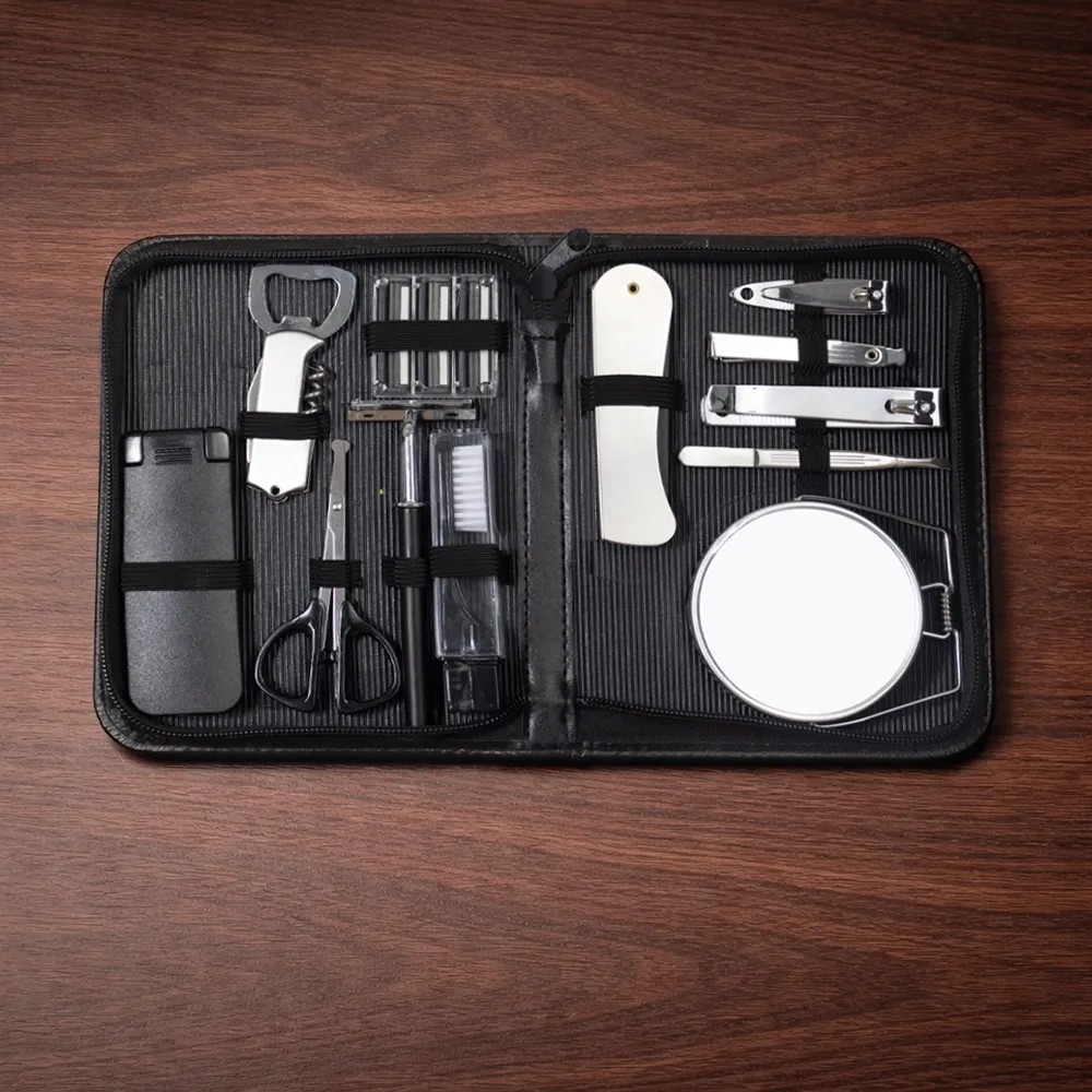 Kit masculino 12 peças em estojo de couro sintético, parte interna revestida com plástico em relevo e elástico para fixação dos itens. Possui: removedor de pelos, abridor saca rolha, tesoura, aparelho de barbear, lâminas para barba(3 unidades), escova de dente, pente, cortador de cutícula, mini kit unha 3 em 1(empurrador de cutícula, lixa, limpador de unha), cortador de unha, pinça e espelho duplo com aumento.
