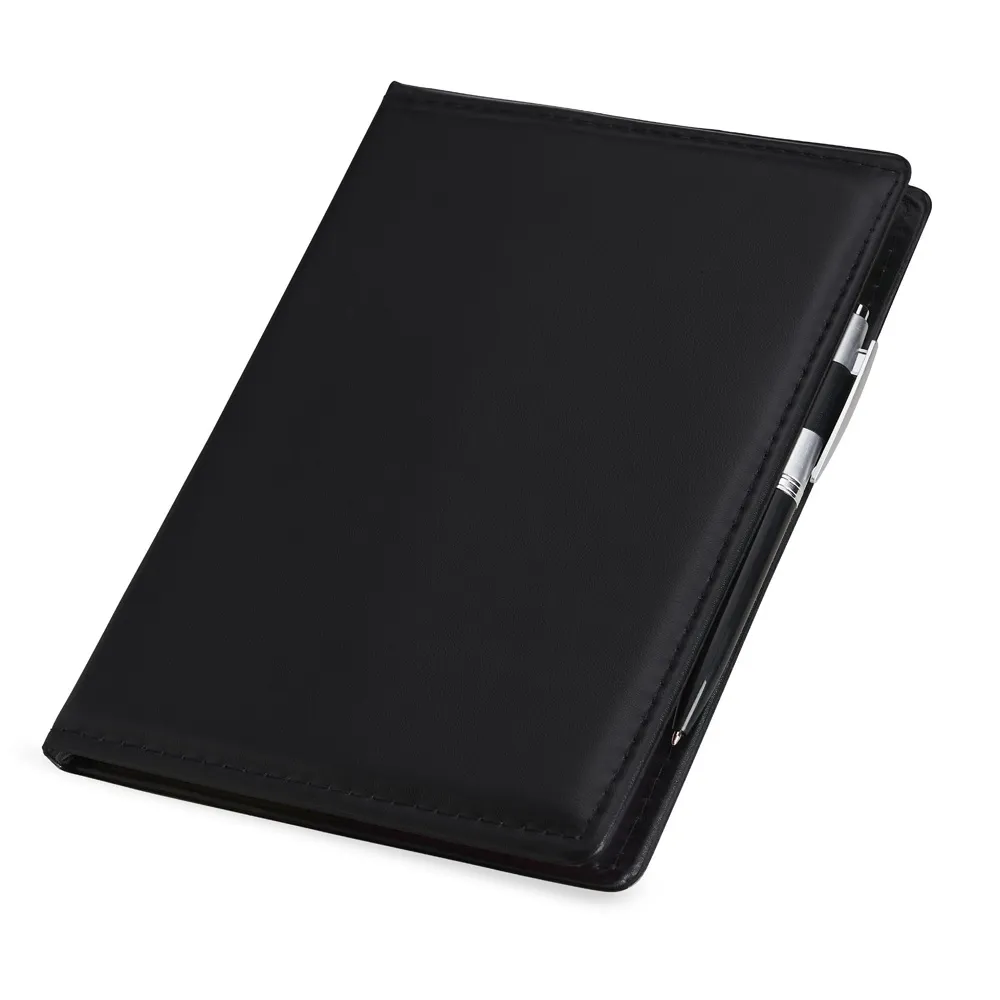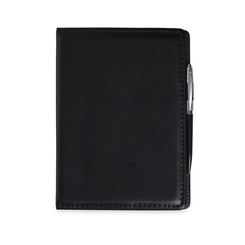 Kit para anotações em couro sintético com autoadesivos e caneta plástica. Contém seis blocos com aproximadamente 50 folhas, conjunto de cinco marcadores plásticos autoadesivos com aproximadamente 26 folhas, bloco A5 com aproximadamente 50 folhas e caneta esferográfica com carga azul e acionamento por clique.\r\n