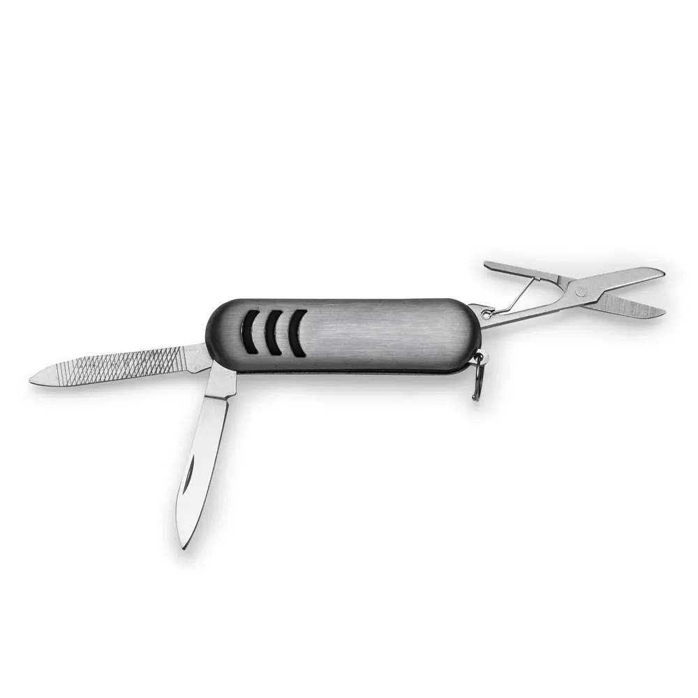 Mini canivete metal 3 funções com detalhes emborrachados preto(três linhas frente e verso). Possui: lixa, lâmina de corte e mini tesoura e acompanha pequena argola para utilizar como chaveiro.