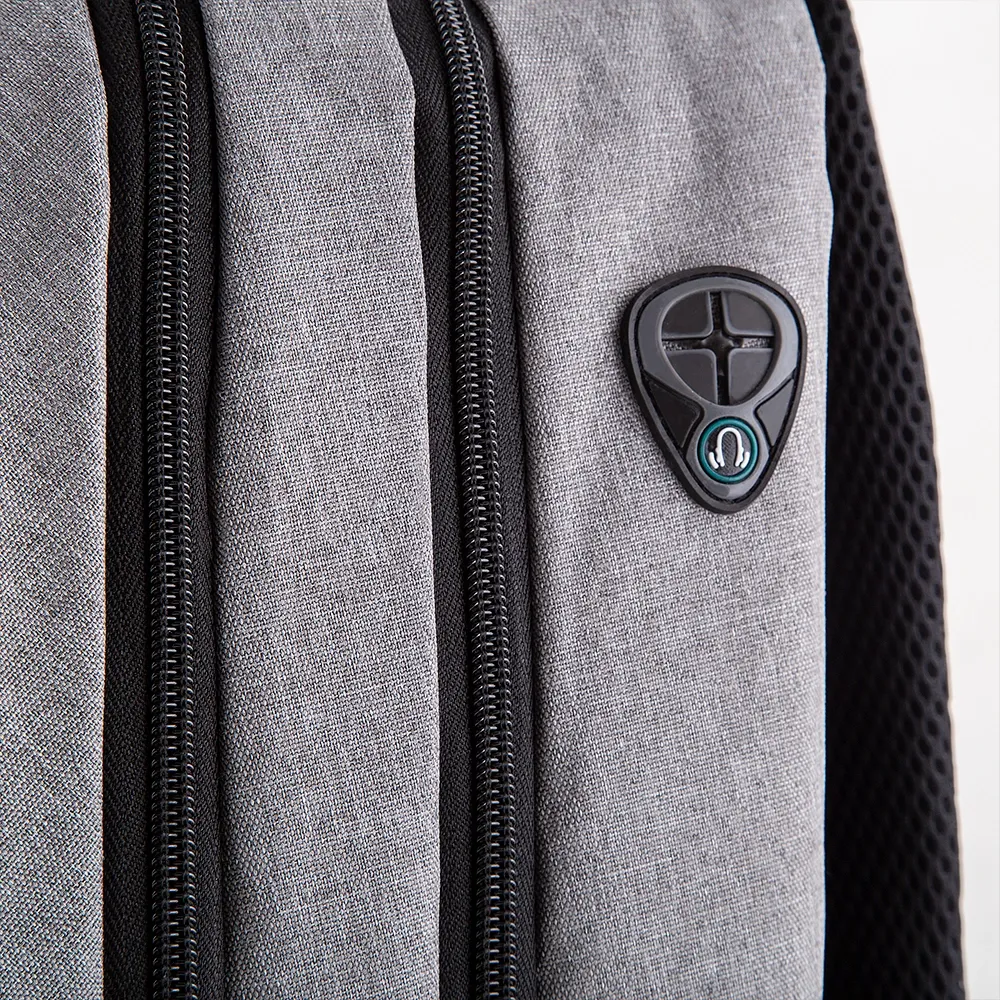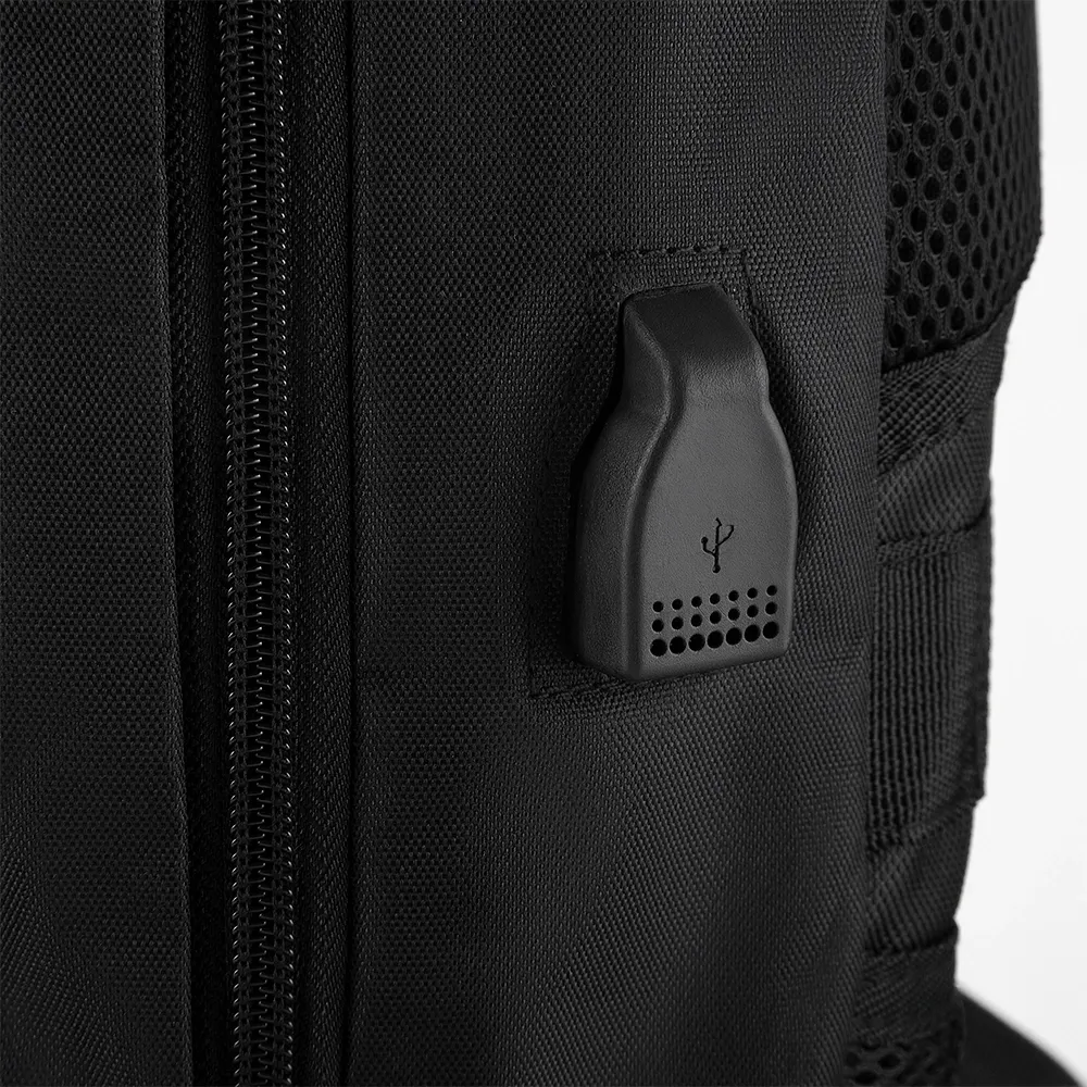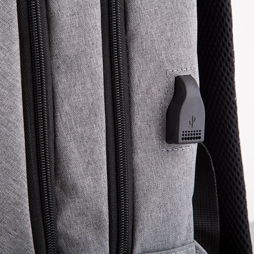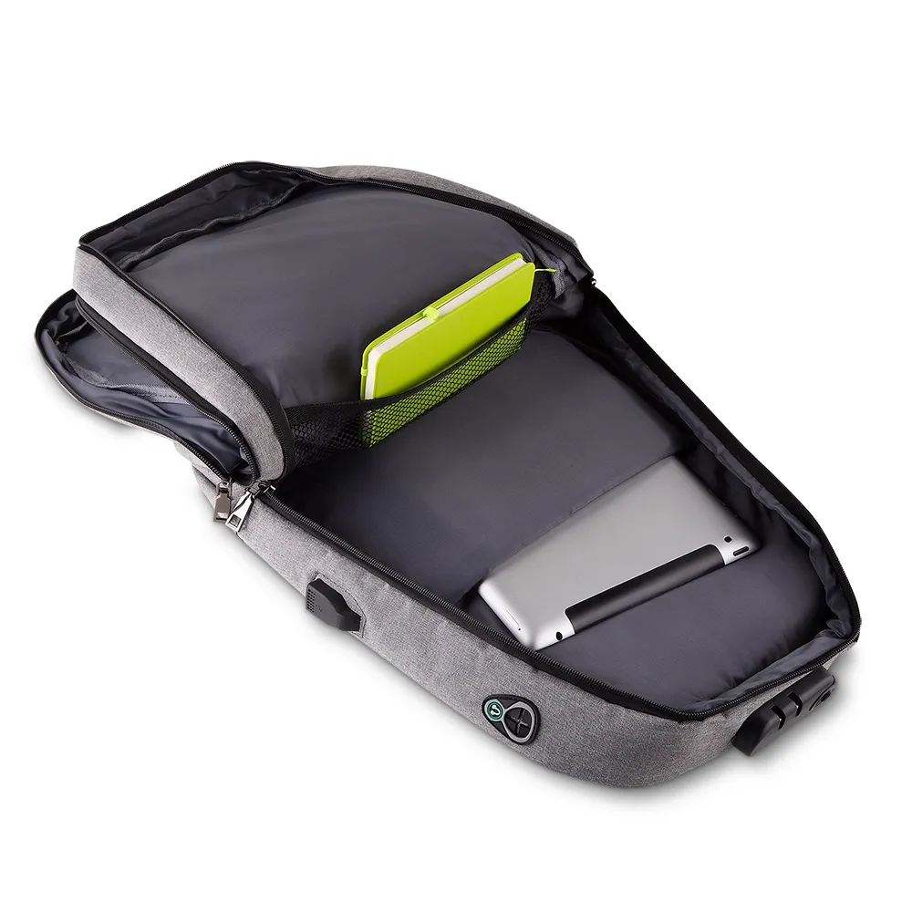 Mochila para notebook em tecido poliéster 50% Oxford e 50% PU e interior em poliéster 210D.\r\n\r\nParte externa:\r\nPossui fechamento em cadeado com segredo;\r\nAlça de mão em metal;\r\nAlça de ombro acolchoada;\r\nMini bolso na alça de ombro;\r\nFita refletiva noturna.\r\nEngate para mala da viagem;\r\nBolso frontal grande.Saída USB e fone de ouvido.\r\n\r\nParte interna:\r\nDivisórias internas para canetas, documentos e telefone celular.\r\n\r\nCompartimento acolchoado para notebook, 43x27cm.\r\n\r\nTamanho total do Notebook - 15.6