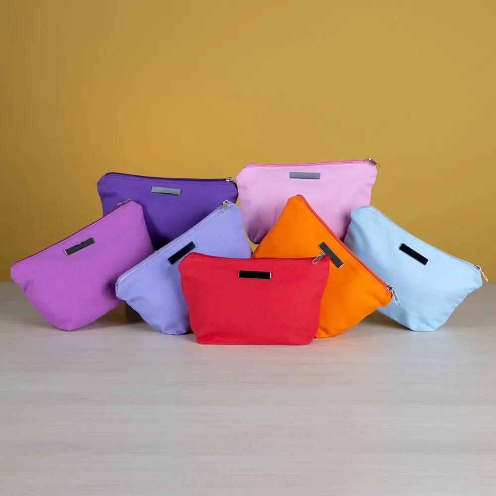 Nécessaire de lona colorida com plaquinha metálica para personalização, possui zíper e forro de poliéster.
