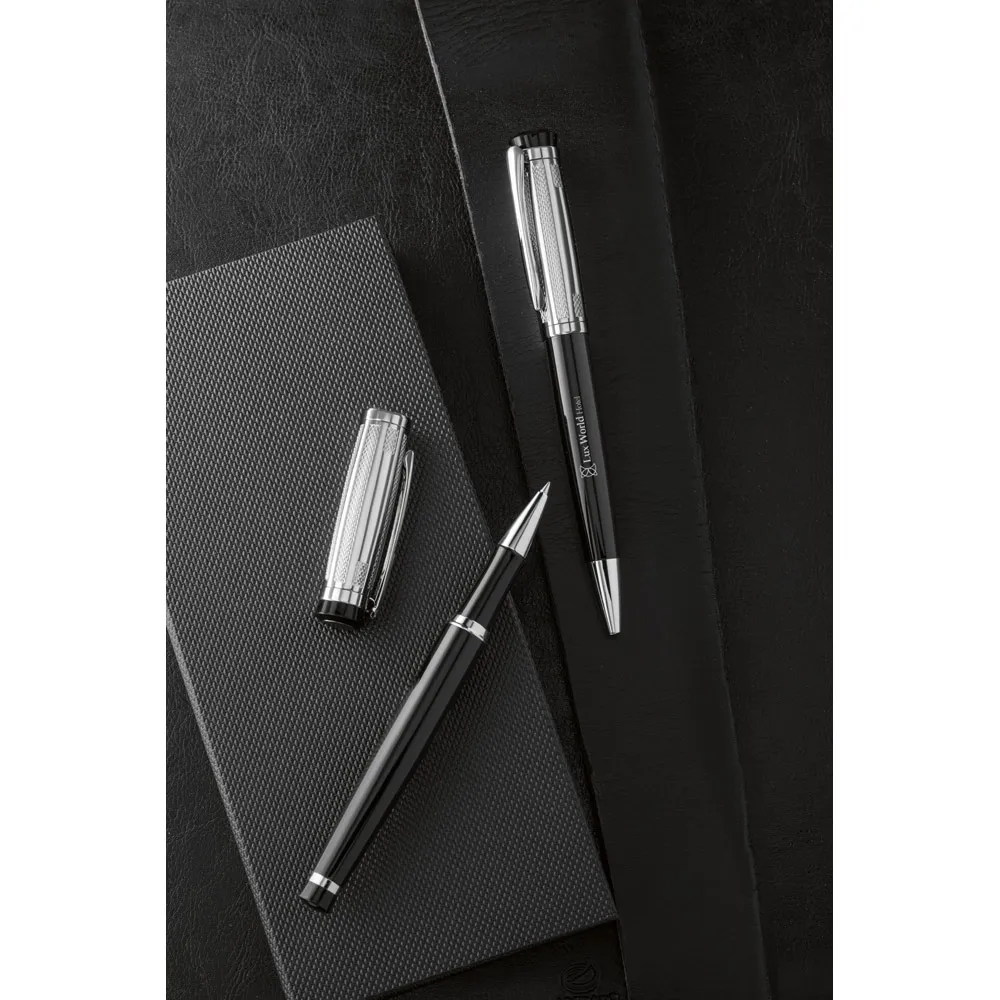 Conjunto de roller e esferográfica sofisticada, em ferro com acabamento brilhante preto e tampa cromada com clipe de ferro. Escrita em azul até 1.5 km. Fornecido em estojo presente almofadado. Esferográfica: ø13 x 136 mm | Roller: ø13 x 135 mm | Caixa: 192 x 34 x 85 mm