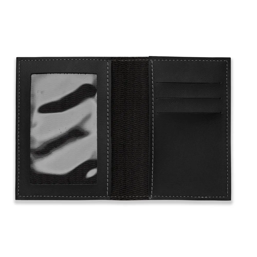 Porta-documento Bidins em couro sintético, capa frente e verso lisa, parte interna com bolso de visor plástico e três divisórias no próprio couro com bolso lateral.