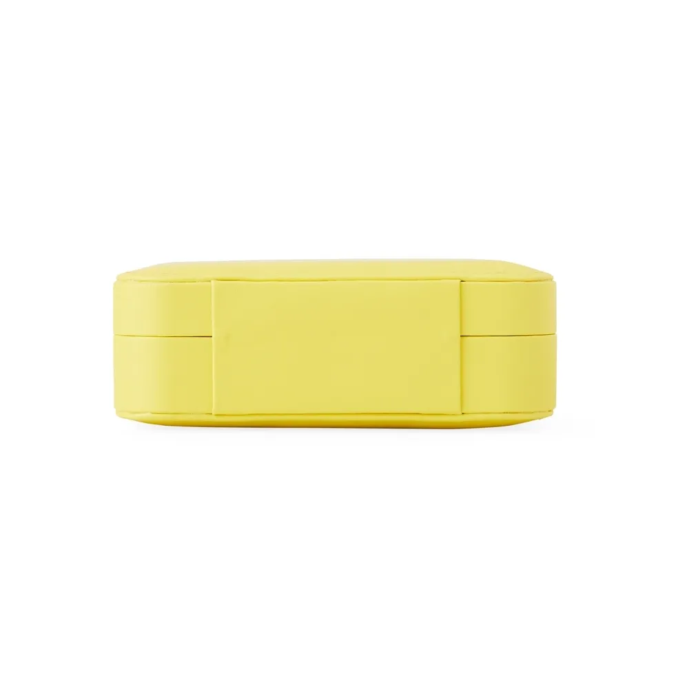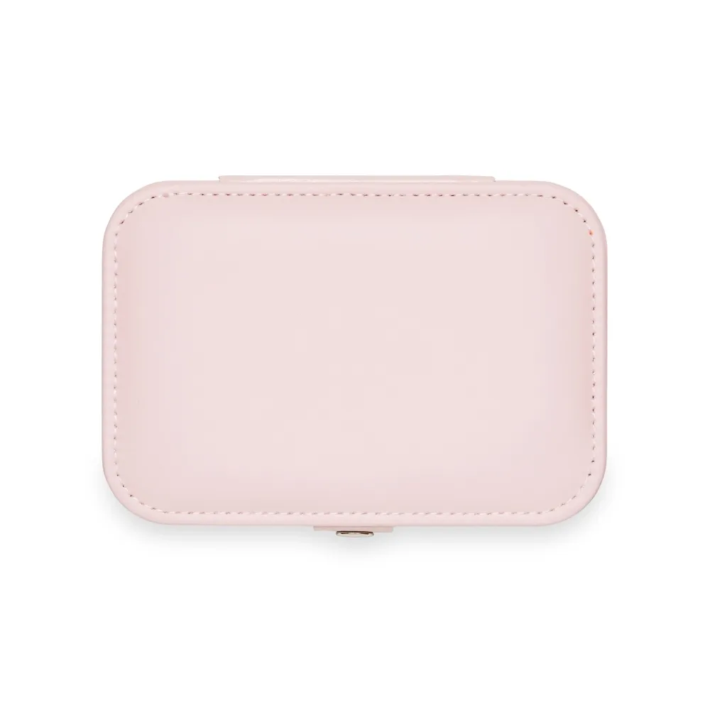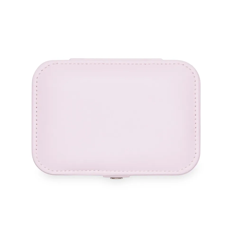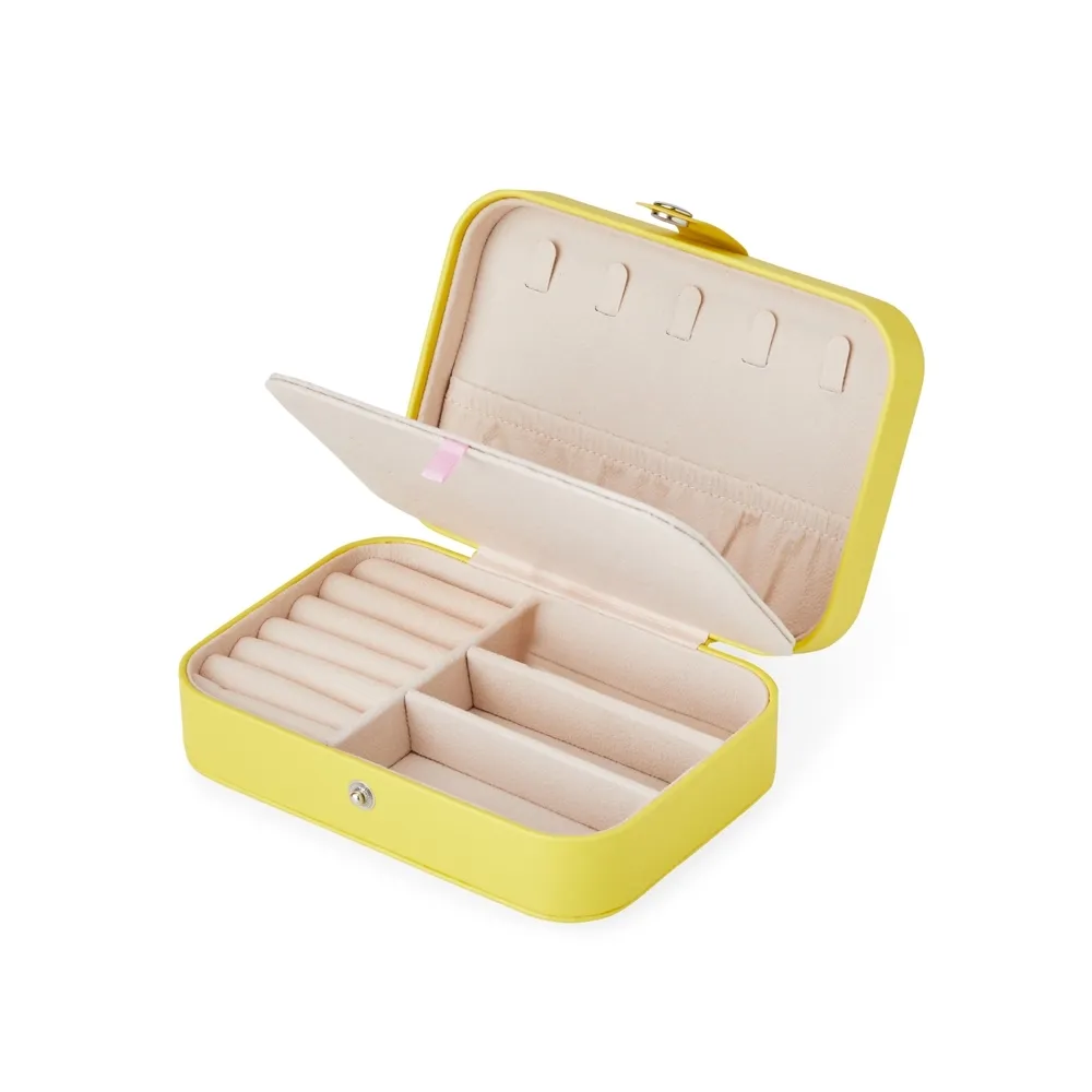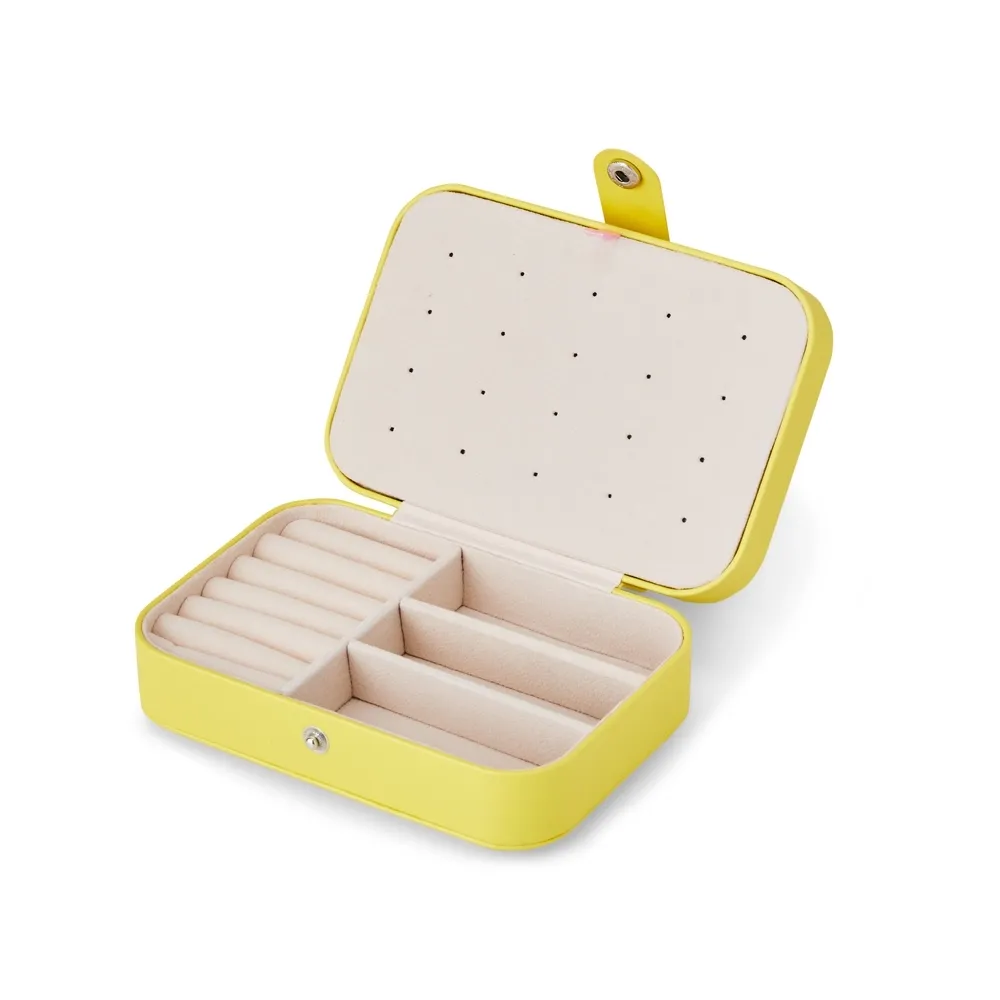 Porta-joias de couro sintético com revestimento aveludado. Possui compartimentos internos para anéis, pulseiras, colares e placa para brincos.