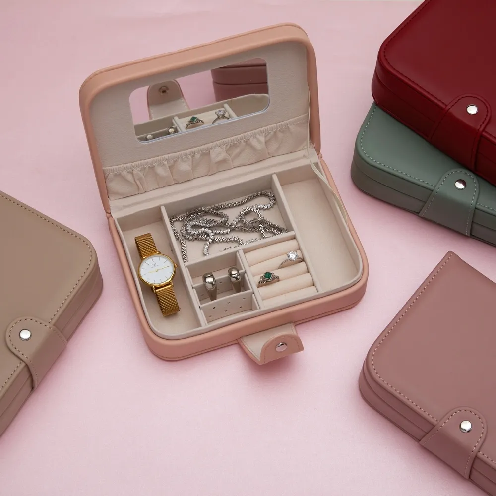 Porta-joias em couro sintético com revestimento aveludado e espelho. Possui compartimentos internos para anéis, pulseiras, colares e placas para brincos.
