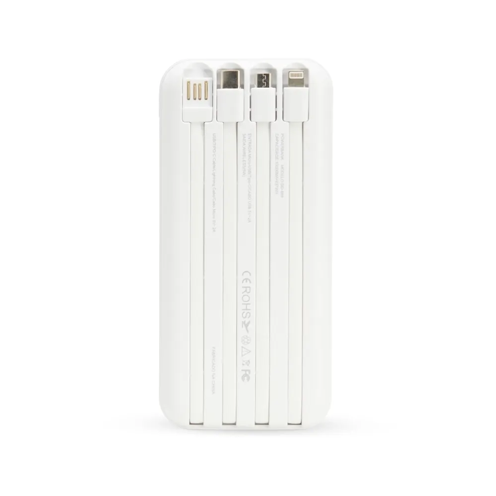 Carregador portátil power bank com 10.000mAh e carregamento via indução ou via cabo. Com display digital indicador de bateria, o carregador contém quatro cabos acoplados: Lightning, Tipo-C, V8 e saída USB para o carregamento da própria bateria. Portas de entrada: V8, Tipo-C e duas portas USB.