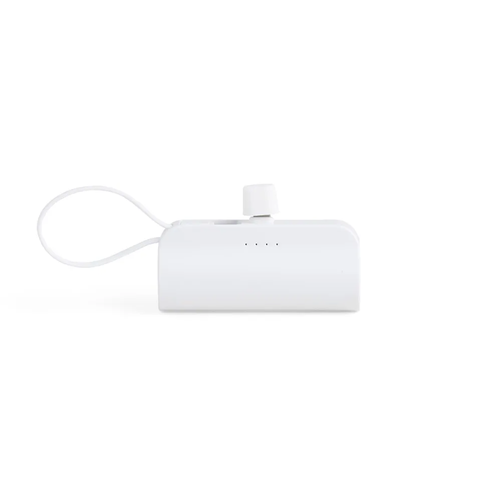 Power bank 5.000mAh plástico com indicadores de bateria em LED, contém haste de suporte para celulares com a entrada Lightning e cabo tipo-C acoplado. Acompanha cabo USB Tipo-C.