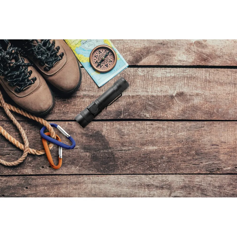Lanterna recarregável de 5W em alumínio. A lanterna tem funcionalidades distintas como: LED com 300 lumens, 4 modos de iluminação, zoom telescópico e interruptor para ligar e desligar a lanterna. A bateria tem uma capacidade de 2 000 mAh, podendo ser recarregado com um cabo USB-C. Fornecido em caixa presente de papel kraft reciclado. 28 x 126 mm | Caixa: 32 x 32 x 130 mm
